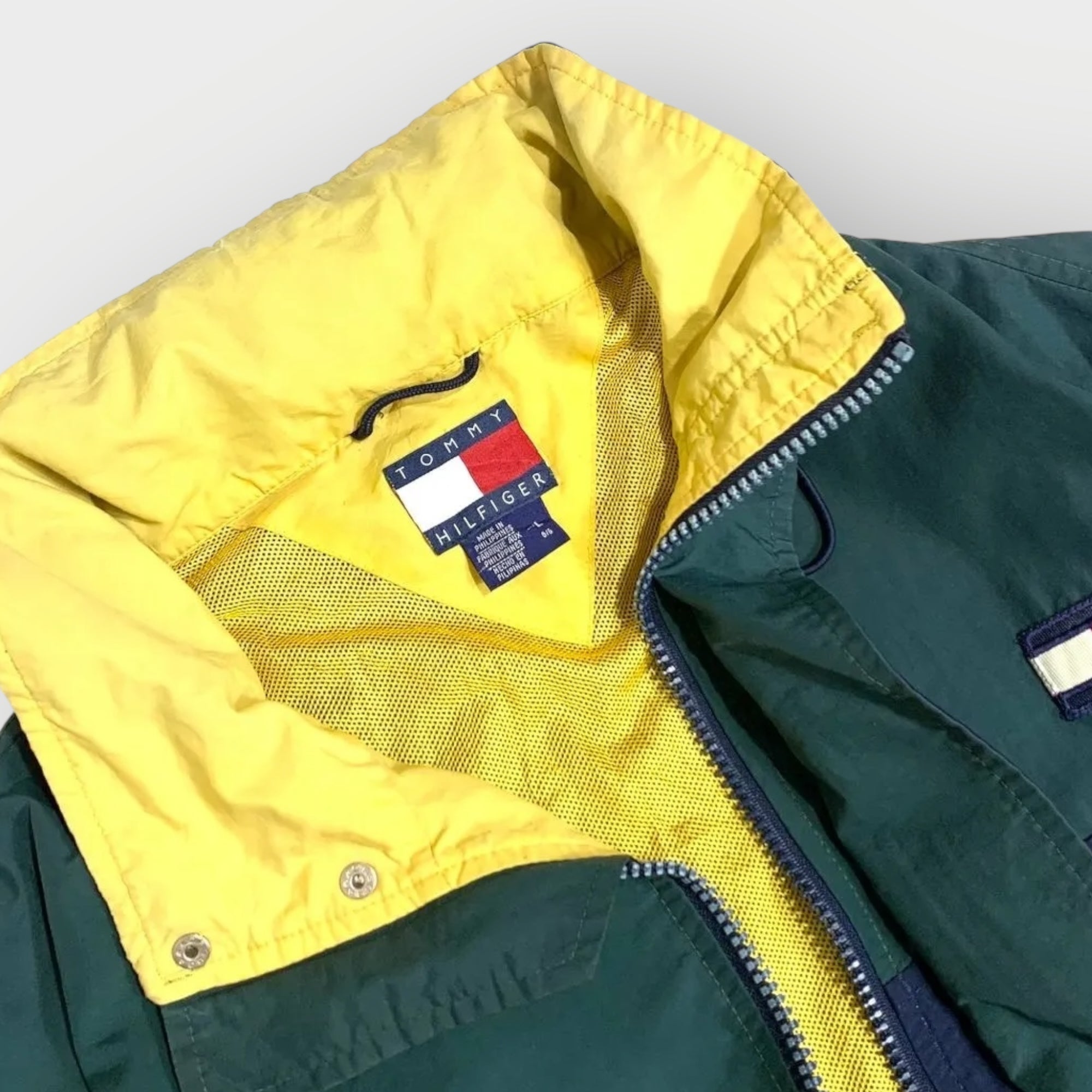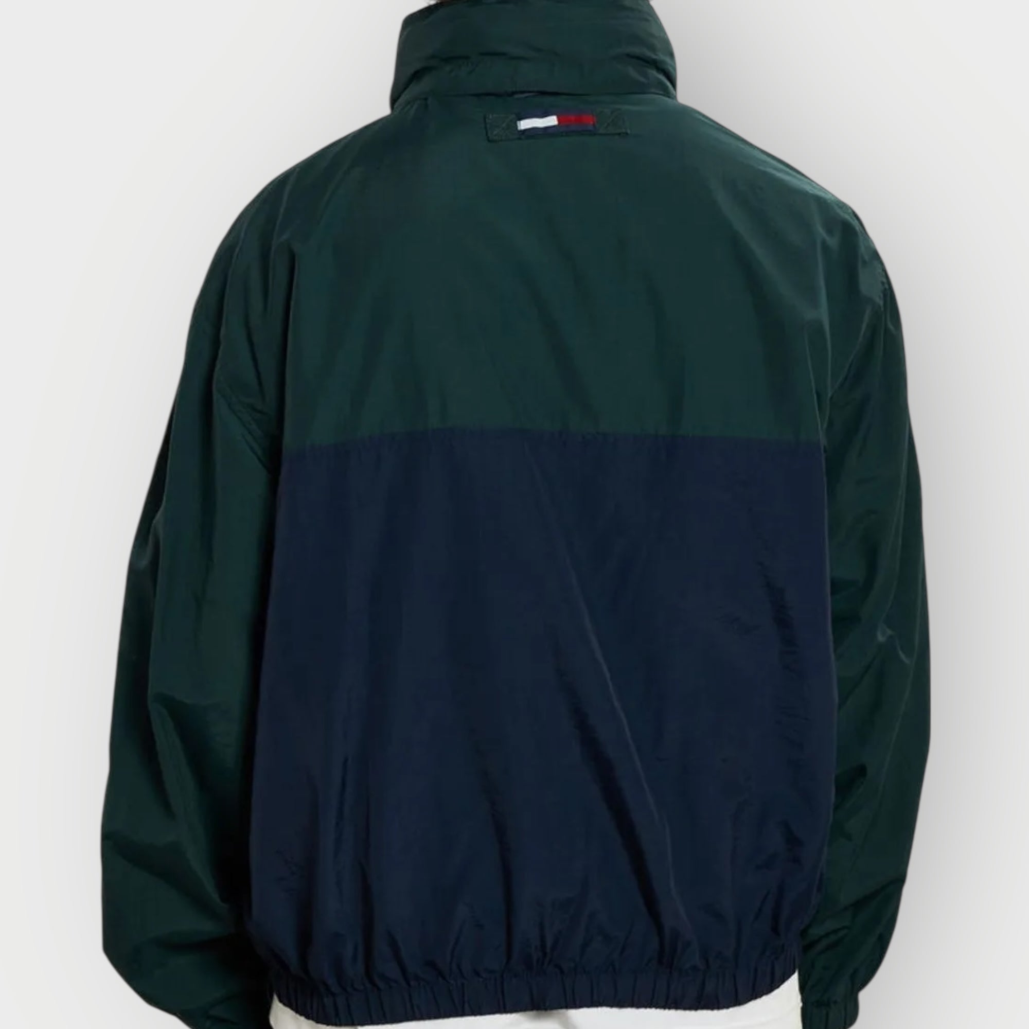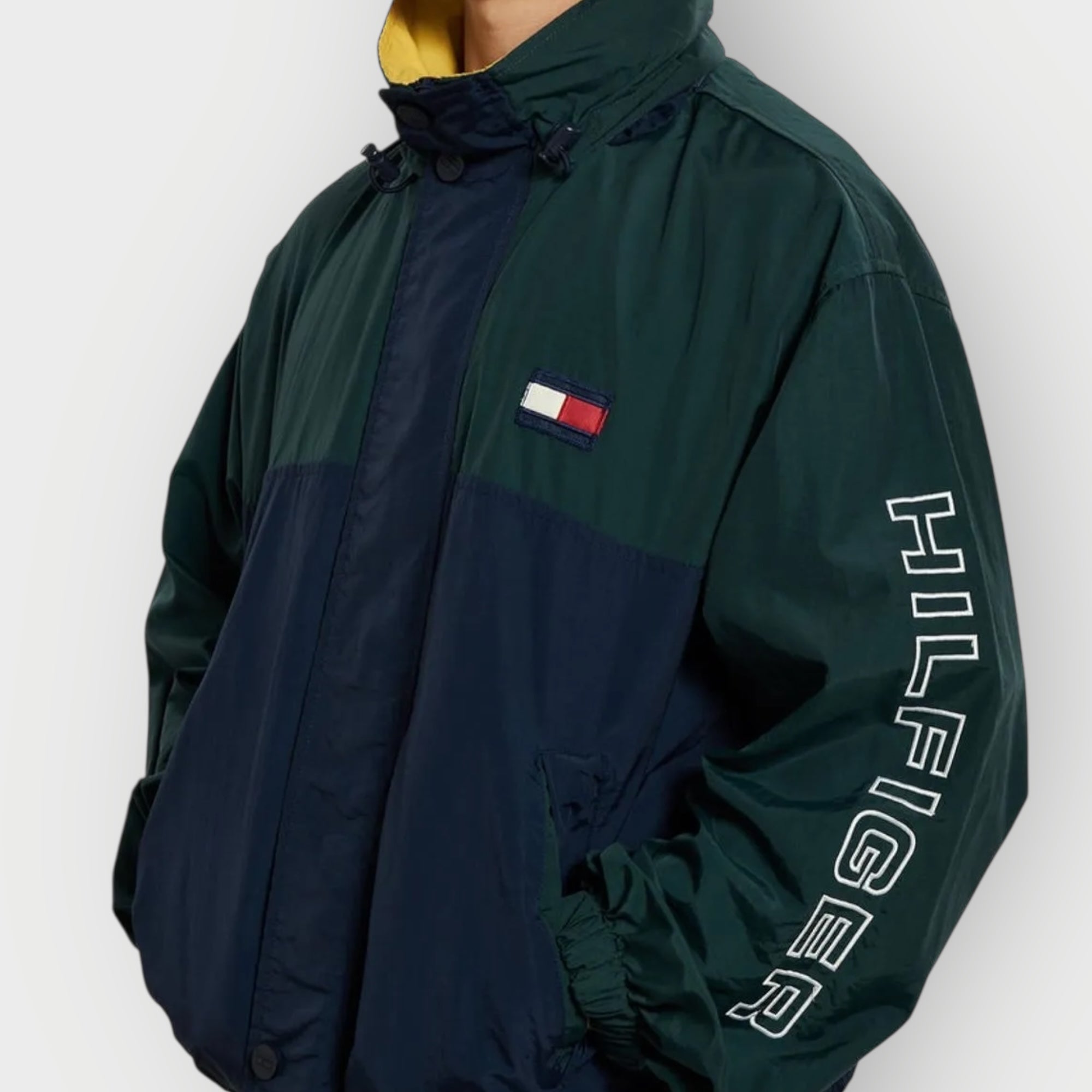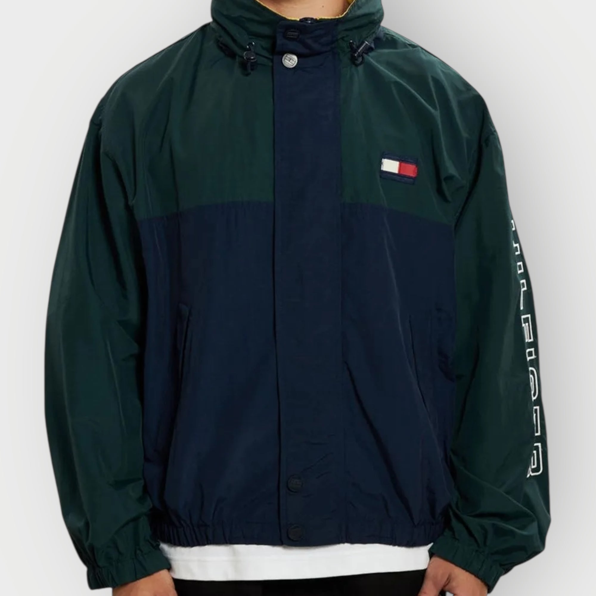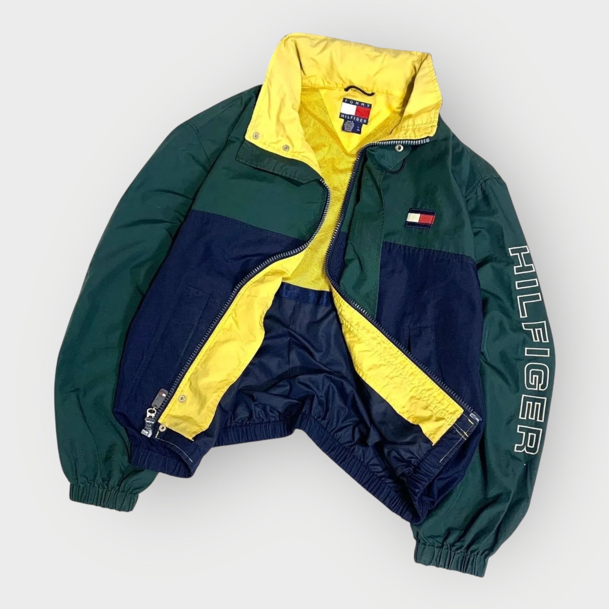 Vintage Tommy Hilfiger Jacket aus den 90s im ikonischen Green–Navy–Yellow Colourblock – ein klassisches 90s/early-Y2K Piece mit starkem Retro-Sportswear-Vibe. Der typische Oversized-Fit bringt sofort den authentischen Look der alten Hilfiger-Sportswear-Ära.